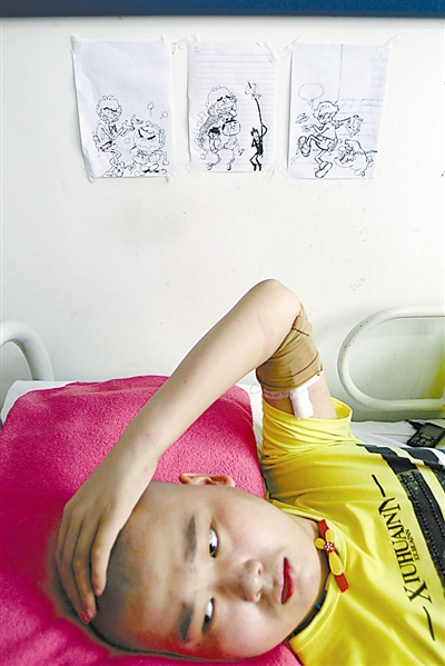 喜欢动漫的孙毅在病床前贴着自己画的漫画。