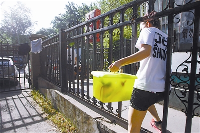5月30日,王翠平钻过所住地下室外的护栏到医院给儿子送饭。
