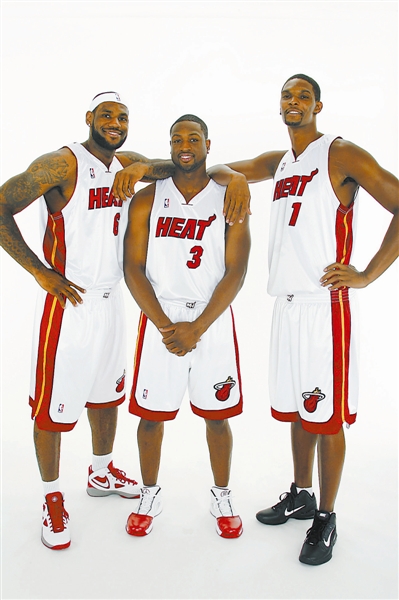 赢得总冠军,拿着总额超过5000万美元高薪的热火“三巨头”詹姆斯、韦德、波什(从左至右)算是物有所值。CFP 供图