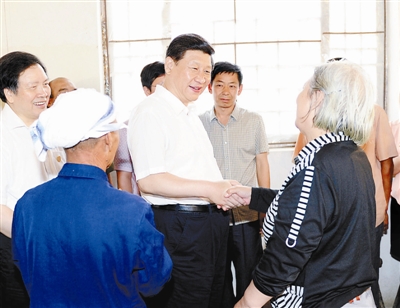 7月11日至12日,中共中央总书记、国家主席、中央军委主席习近平在河北省调研指导党的群众路线教育实践活动。这是习近平在平山县西柏坡革命旧址同当地群众握手交谈。