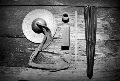 ③一张高台,半副铙钹、一块醒木,配以扳指、竹箸,就是福州评话艺人的全部装备。