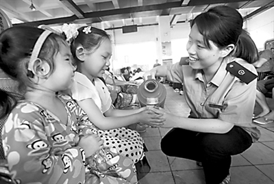 暑运开始以来,郑州铁路局南阳车务段管内车站出现了儿童探亲客流高峰。该段加强儿童旅客乘降过程中的引导、防护和盯控工作,确保“娃娃兵团”安全出行。图为南阳站客运人员热情为小旅客免费提供开水。郭永林 摄