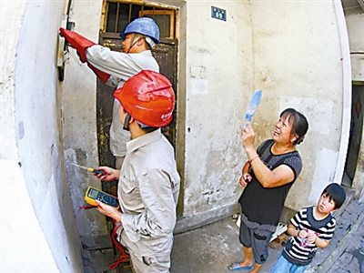 7月9日,国家电网浙江金华供电公司的抢修工作人员在金华市区秋滨黄山巷69号为住户更换螺丝。