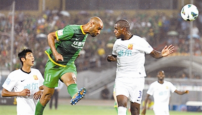 7月14日晚,在2013赛季中超联赛第17轮比赛中,北京国安主场3比1击败武汉卓尔。图为双方队员争抢头球。 本报记者 许之丰 摄