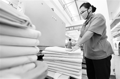 7月15日,在兰州铁路局银川客运段列车卧具洗涤车间内,洗涤工人正在将熨平的床单被套折叠整齐。