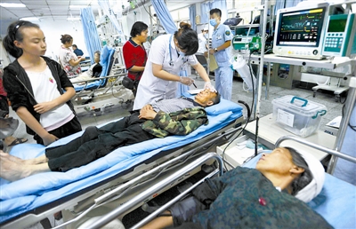 7月16日,四川省人民医院急诊科的医生为汶川县草坡乡伤病员诊断。