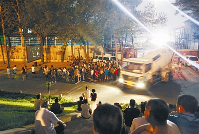在现场,笔者还观察到,放映期间大型水泥搅拌车、工程车不断从工地进出,穿过看电影的人群,转弯时离两边观众距离过近,还扬起阵阵尘土,工地安全管理存在明显隐患。