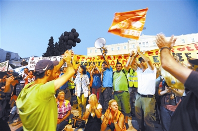 7月17日晚,在希腊雅典市中心的宪法广场,示威者在写有“面包、教育和自由”的标语下面呼喊口号,抗议该国政府拟推行的新一轮紧缩措施。希腊议会18日凌晨通过包括大规模裁员等内容的一揽子紧缩法案,为希腊近期获得数十亿欧元的救助贷款铺平了道路。 新华社发