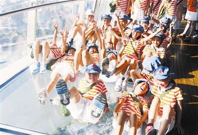 7月18日,上海。来自安徽大别山“将军县”金寨县希望小学的20多名红军的后代当日登上了东方明珠电视塔的悬空观光层。这些“红军娃”利用暑假来到上海参加夏令营活动。钟阳摄/东方IC