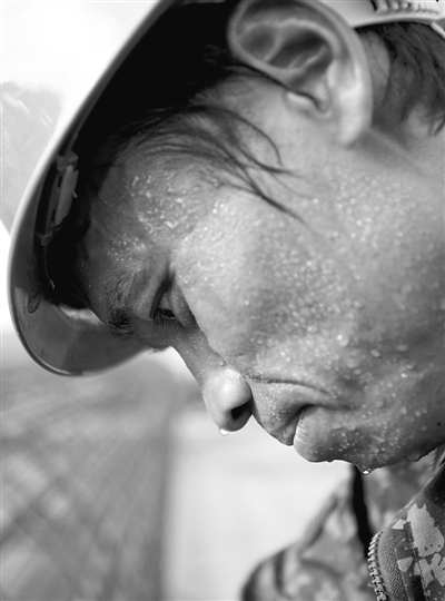 黝黑的脸庞、一双炯炯有神的眼睛,汗水顺着额间流下。