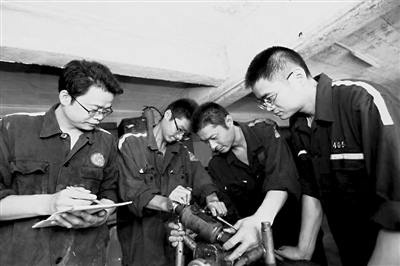 7月17日,安徽淮北矿业集团岱河矿业公司基建区维修工会伟(左二)和工友郭明海(右二),在维修中革新,成功用旧配件把风钻连接头改成灵活、耐用的旋转式连接,受到职工们的称赞,原风钻连接头是钢编管,使用中磨损、窝折是个易损部件,更换一根要200多元,会伟和郭明海找来原来报废的旧配件加以改进,这活就完成了。王明明 摄