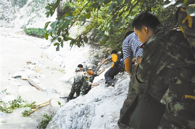 上山的路上我们还碰到了在山里的大学生志愿者,他们说在山里困了好几天,趁着天气好赶紧往山外撤离,行进到“天梯”时他们已走了6个小时。