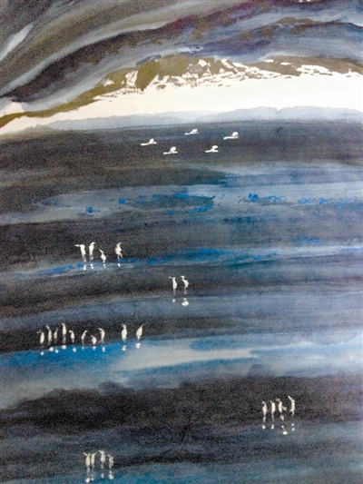 纳木错是中国第二大的咸水湖。位于西藏中部,湖面海拔4718米。湖的形状近似长方形,东西长7000多米,南北宽3000多米,保持着自然原始生态,是朝圣者心目中的圣地。湖面圣洁的水鸟或飞舞或栖息,让人真正看到了自然的和谐。中国画/李秭溪