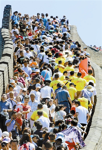 暑假来临,大批游客携家带口进北京,八达岭景区像直线上升的温度计一样持续爆棚,拥挤不堪的游客将长城堵得水泄不通。这是笔者7月16日在北京最著名的旅游景点八达岭长城上拍到的一幕!