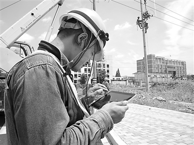 7月8日上午,浙江富阳市高桥镇,国网富阳市供电公司工作负责人孙春富拿着平板电脑,对着上面的电子票系统进行工作许可、验证身份、挂设地线等一系列操作。该局自去年7月创新研发该电子票系统,通过智能手机或平板电脑等3G终端来实现现场票面操作。(胡宇芬 文/摄)