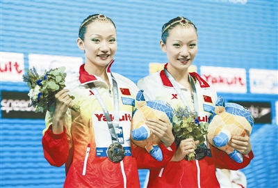 7月21日,在巴塞罗那举行的第15届国际泳联世界锦标赛花样游泳双人技术自选决赛中,中国选手蒋文文/蒋婷婷以94.900的成绩获得亚军。 新华社记者 谢海宁 摄