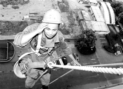 外墙清洗工被人们称为“蜘蛛人”,他们攀爬在城市高楼的外墙上进行清洗作业,为了工作时能够凉快一些,他们往往清晨4点就上班。为了安全,他们总是穿着长袖长裤,套着绳索,戴着安全帽,全身被包裹得严严实实。 丁汀 摄(新华社发)