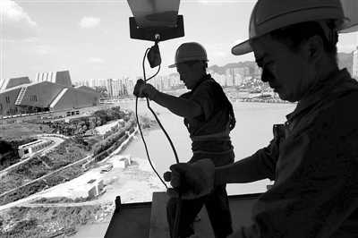 7月24日,在重庆市重点工程——千厮门大桥施工现场,两名建设者在加紧施工。近日,重庆持续高温天气,7月24日最高气温达38摄氏度。重庆市劳动部门规定,户外作业一律避开高温时段,同时,一些用人单位还发放了防暑降温药品,让户外劳动者安全度夏。新华社记者 李健 摄