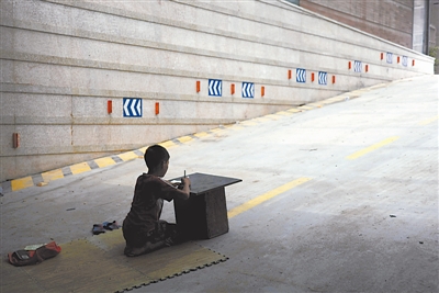 小区里有个还未启用的停车场,停车场出入口摆着一张黑色的破旧小木桌。这里,就是明学每天看书学习的地方。“这儿凉快,写作业比较好。”最初明学并没有课桌,他都是趴在一张破旧的席子上看书写字。后来一次偶然机会,明学跟着父母从废弃的垃圾堆中捡回了这张破旧黑色小桌。