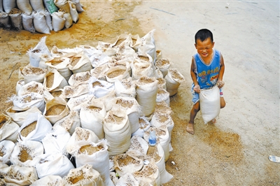 宣宣提起十几斤的沙袋很艰难,但他经常会帮父母干活。