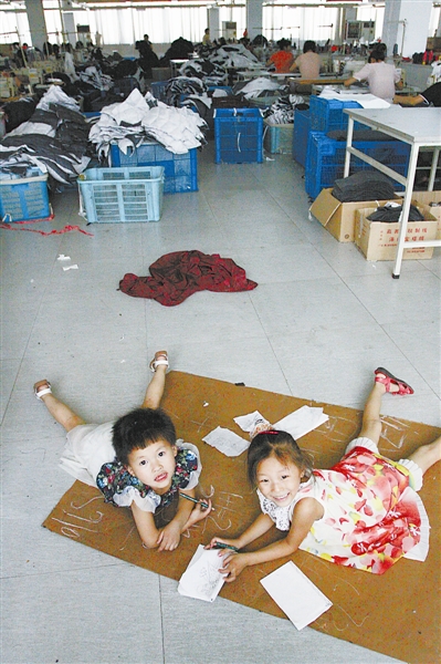 7月17日,浙江省嘉善县一家制衣厂车间里,两名来自山东和福建的“小候鸟”在游戏、画画。胡凌翔 摄/CFP