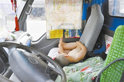 虽然妈妈也在幼儿园工作,但是妈妈不想把小梦哲带到工作单位,“假期就是想让他放松些,不想再带他去学校了”。所以,小梦哲有时和爸爸出车,困了就睡在驾驶室内,天热,干脆就光着身子睡,爸爸把地图摊开挡在车窗上为小梦哲遮阳,爸爸和工人在外边卸货,刚刚睡醒的小梦哲在驾驶室内静静地躺着,好像还沉醉在睡梦中。