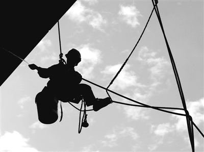 外墙清洗工被人们称为“蜘蛛人”,他们攀爬在城市高楼的外墙上进行清洗作业,为了安全,他们总是穿着长袖长裤,套着绳索,戴着安全帽,全身被包裹得严严实实。