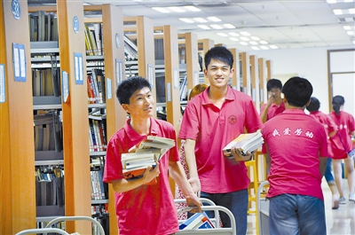 7月24日,郑州,刚接到录取通知书的大一新生在学校图书馆里整理图书。