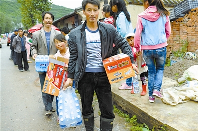 7月25日上午,甘肃漳县石川乡龙虎口村的受灾群众排队领取食品。甘肃岷县漳县6.6级地震发生后,全县13个乡镇136个行政村全部受灾,其中石川、四族、大草滩等10个乡镇受灾严重。本报记者 康劲 摄