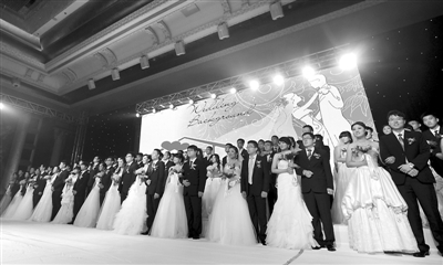 当日,特变电工沈阳变压器集团有限公司在辽宁沈阳为员工举办“相约特变情,共圆中国梦”集体婚礼。49对来自一线的青年技工在父母和同事的见证下喜结良缘,牵手步入婚姻殿堂。杨新跃 摄(新华社发)