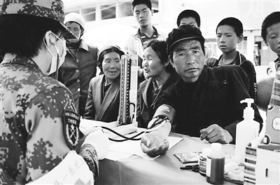 7月24日,解放军第一医院医疗队在岷县禾驮乡街头为受灾群众治病。为了让甘肃岷县漳县6.6级地震中的伤者得到及时有效救治,医疗救援人员在伤员较为集中的乡镇设立了临时医疗救助点,为伤势较轻的灾区群众义务诊治,而将伤势较重的灾区群众及时转移到岷县、定西和兰州接受治疗。