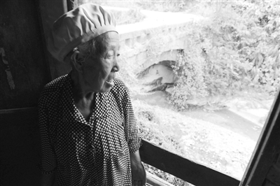 82岁的程攀珍老人在桐梓县小溪河边住了几十年,她说,这条从没干过的河,今年断流了(7月26日摄)。