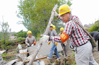 “农民工大叔”们正在清理危房。本报记者 康劲摄