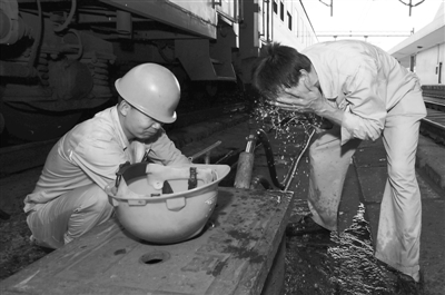 7月27日,45岁的上水工毛剑容(右)和工友在列车上水间隙洗脸解暑。
