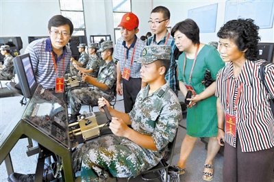 7月28日,来自全国各地的200名全国劳动模范来到北京军区某坦克师,观看了仪仗队表演和官兵们的模拟战术训练。