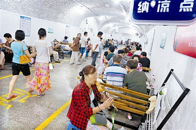 7月28日,人们在杭州免费开放的人防工程避暑洞里纳凉。自24日起,杭州最高气温连续多天超过40℃,浙江多地气温破60多年来最高纪录。 新华社发(李忠 摄)