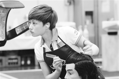 中国选手胡已雪在比赛现场比拼美发技艺,她最终获得银牌。