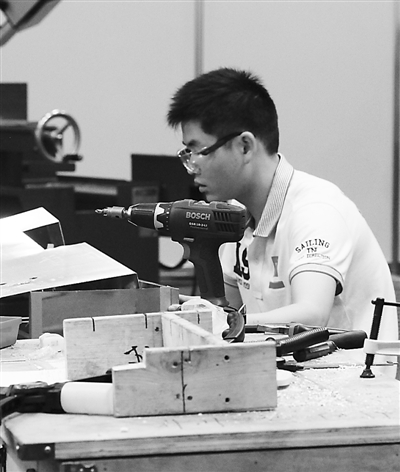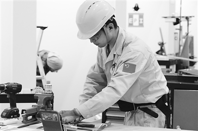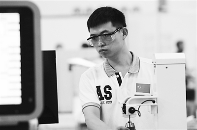 面对世界各国强手,中国选手表现淡定,从容不迫。图为选手在有条不紊操控比赛设备。