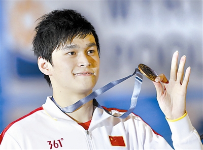 7月28日,在第15届世界游泳锦标赛男子400米自由泳决赛中,孙杨以3分41秒59的成绩夺得冠军。图为孙杨在颁奖仪式上展示金牌。新华社记者 王丽莉 摄