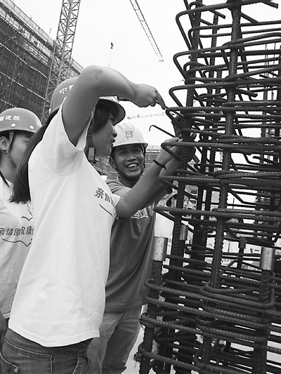 本报讯(记者张锐)“爸爸,你工作时一定要注意安全,别让钢筋划到了。”来自四川万源市花楼乡的留守儿童饶静一边跟爸爸学着绑扎钢筋,一边叮嘱着。7月26日,在中建二局保华公司举行的“亲情呼唤安康”活动中,26名像饶静这样的“小候鸟”从家乡来到父母身边,在工地上亲身体验了一次父母的工作。农民工教孩子体验操作也成为该公司承建的大兴生物医药基地项目部工地上一道独特的风景。