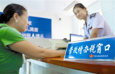 8月1日,在山东滨州市博兴县国税局办税大厅,工作人员谢永丽(右)正在为一家企业纳税人员办理“营改增”业务。