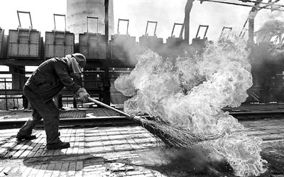 8月1日,炉盖工王蒉生冒着被火烧到的危险,用扫帚将炉口散落的煤扫进焦炉。