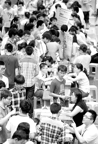 6月29日,浙江工业大学举行“2013年暑期勤工实习招聘会”,近150家企业进校园招聘600多个实习岗位,吸引了在杭高校的1000多名学子前来选岗应聘。施健学 摄