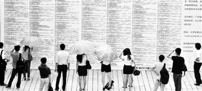 压题照:6月8日,广东工业大学大学城校区,大学生专场招聘会上,求职者在观看招聘单位信息。由省教育厅主办,面向广大应届生的专场招聘会在此举行,众多学子冒着高温、顶着烈日前来寻找合适的职位。今年大学生就业形势严峻程度甚于往年,699万的高校毕业生创历史新高,1000人以上的大型企业用工需求降幅达3.6%,“结构性失衡”矛盾突出,被称为“史上最难毕业季”。CFP供图