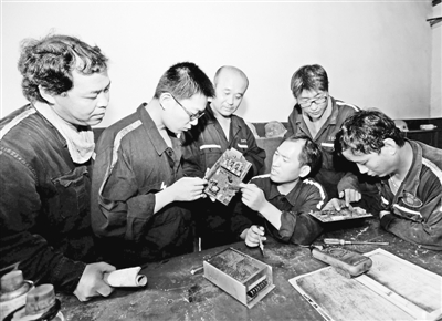“修好一块主控板,可以节省一万多元。”7月31日,安徽淮北矿业集团岱河矿业公司运输区机电队机修班,技术员张海兵(左二)和维修工张磊(中)组建的维修创新小组,通过对旧的变频电机车控制器主控板继电器进行改进,成功地把原来一坏就换、整套两万多元的控制板变成现在只需更换500多元的配件就能修复使用,而且比原来的还要耐用。青工王智(右二)高兴地说:“原来没成立创新小组,大家是能换不修、能弃不留,现在大家不仅学到了技术,动手能力提高了,转变成了能修不换,能修不弃、能修不废,创新还让我们获得了公司奖励,真是名利双收啊!” 王明明 摄