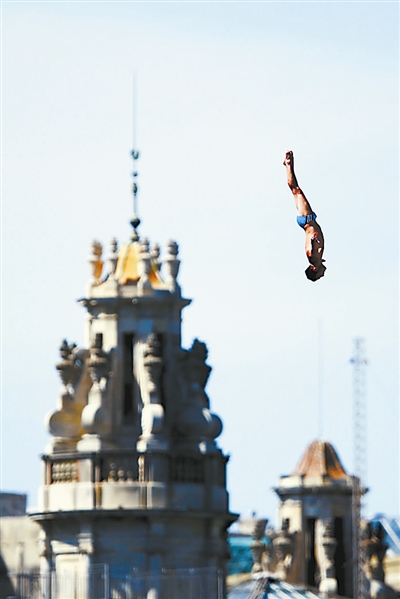 9层楼高的跳台上,捷克运动员纳夫拉蒂尔身着泳裤,脖子上系着的红色披风随风而起。看到“超人”扮相的他,台下的观众们激动不已,掌声雷动,尖叫声、口哨声此起彼伏。随着现场主持人倒计时的结束,纳夫拉蒂尔纵身一跃,在空中摆出“超人”标志性的单臂向前的造型后,笔直落入巴塞罗那旧港(PortVell)的水中。几秒钟后,在三名潜水员的保护下,他浮出水面,一边向潜水员做出“OK”的手势,一边高举着手臂用力地向观众们挥舞,像英雄一样享受着全场的欢呼。