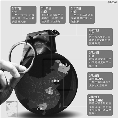 以北京为例,从7月17日到7月26日,一周时间连续发生6起恶性治安事件,其中4起存在恶意伤人行为。这期间,轰动全国的长春盗车杀婴罪犯周喜军被核准死刑。此前6月7日,厦门的陈水总在公交车纵火,导致47人身亡。就在北京被摔女婴离开人世的7月26日凌晨,黑龙江海伦联合敬老院发生火灾,造成11人死亡,年龄最大的87岁,最小的46岁。7月21日,女歌手吴虹飞在微博上扬言要炸北京建委,后被行政拘留。7月29日,深圳罗湖区发生恶性杀人案件,一男子持刀砍杀无辜路人造成三死五伤。