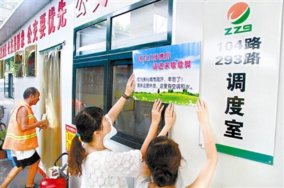 “环卫工师傅们,请进来歇歇脚。”8月4日,河南郑州公交四公司职工在紫荆山立交桥下104路公交调度室挂起了温馨提示牌。