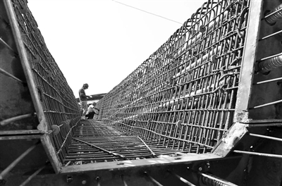 8月3日,在三淅高速公路工地上,两名工人在捆扎空心梁片的钢筋。