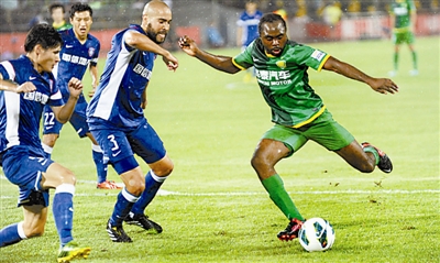 8月4日,2013赛季中超联赛第19轮北京国安主场对阵江苏舜天的比赛在大雨中进行,最终双方战成3比3。图为国安队队员乌塔卡(右一)在对方门前攻门。本报记者 许之丰 摄